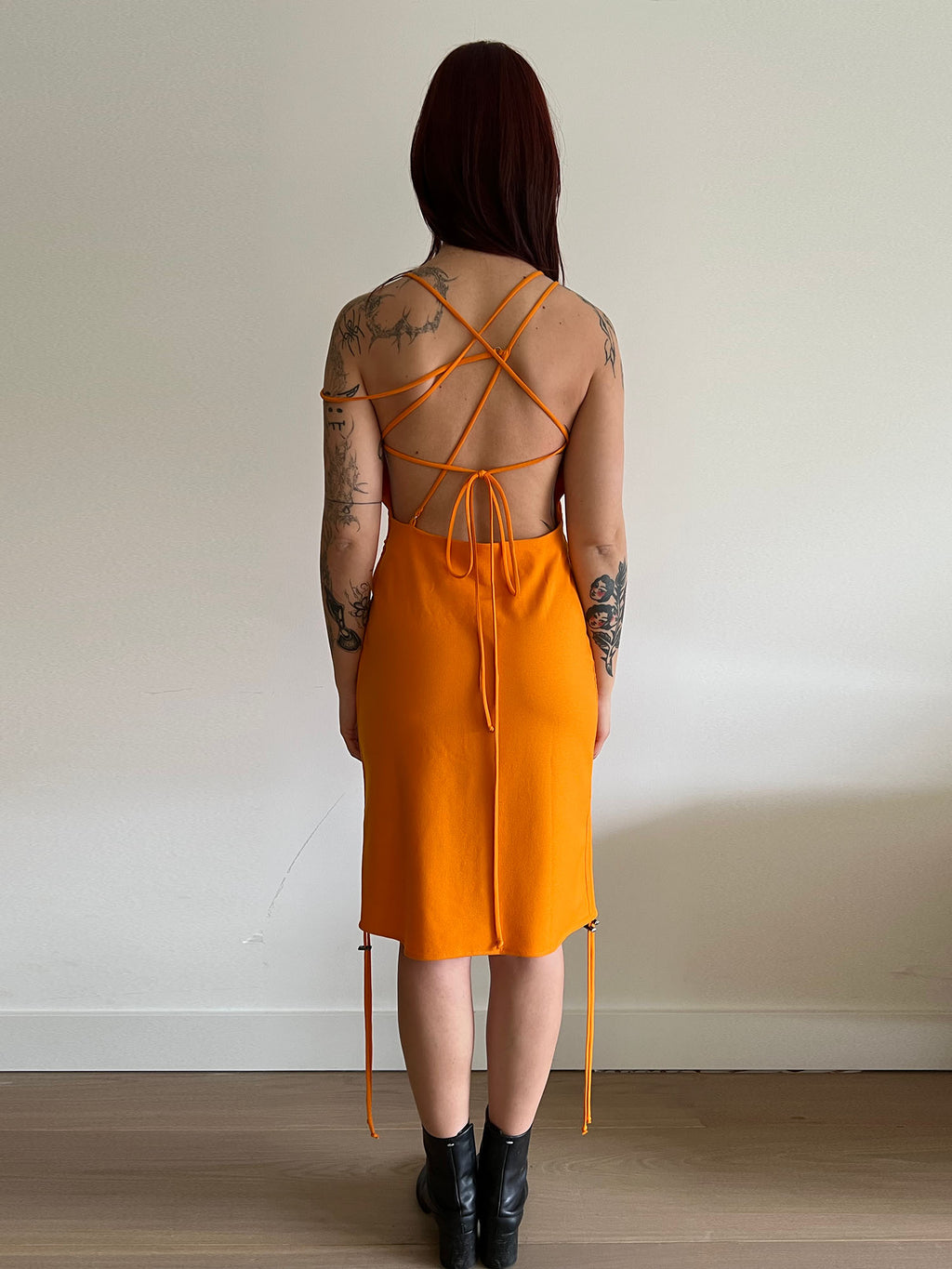 The EMILIJA dress comes back this season in an exclusive edition in atomic orange, perfect for the hot summer days ahead. This dress has side adjustments allowing you to modify the length as you want — whether it's a midi or mini dress.