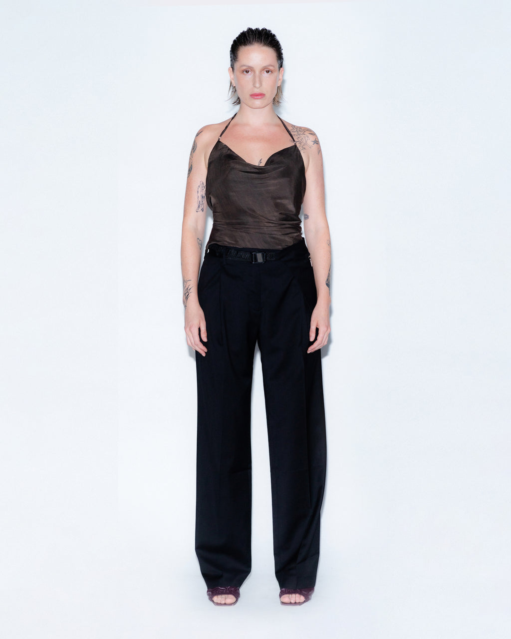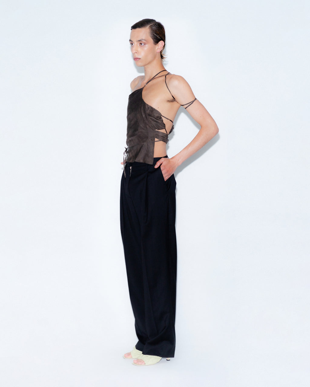 Pleated trousers that add class to any occasion. Goes best with a small top for a steamy summer night or a nice shirt for a morning meeting at the office. Made of soft wool it comes with detachable belt/bag with a back pocket.