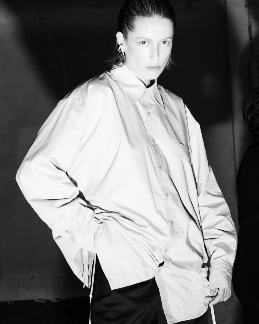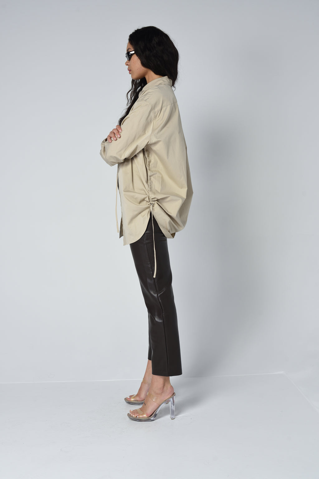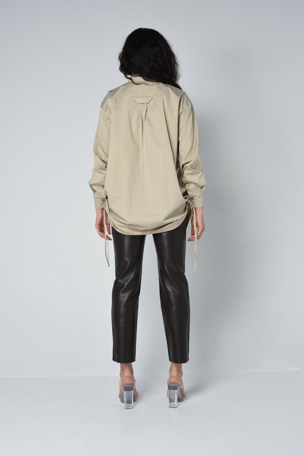 This is a shirt on your terms. Wear it as an oversized look, as a structured top or as a dress with a pair of biking shorts. This piece is adjustable through two side strings going through a tunnel all around the garment. It begs for you to make it how you want it.